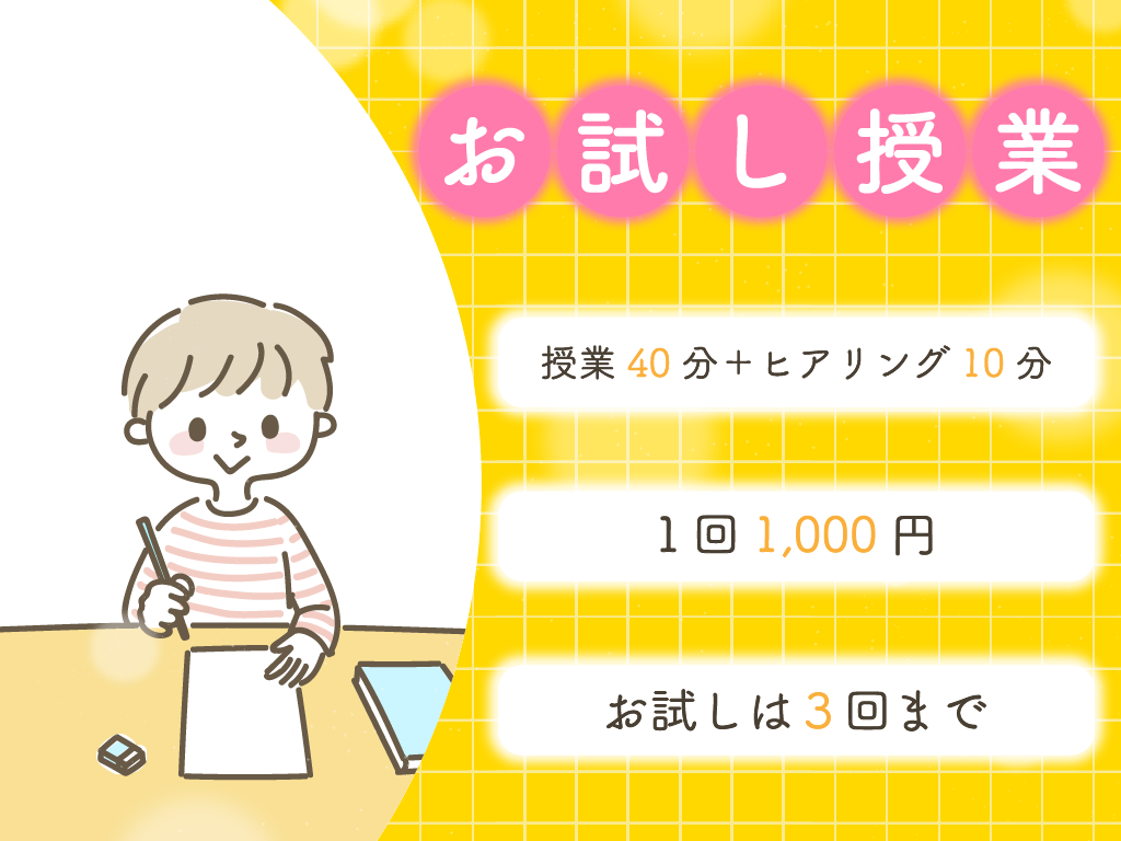 授業 - お試し授業は、1回(授業40分+ヒアリング10分)・1,000円で受けていただけます(最大3回まで)。
